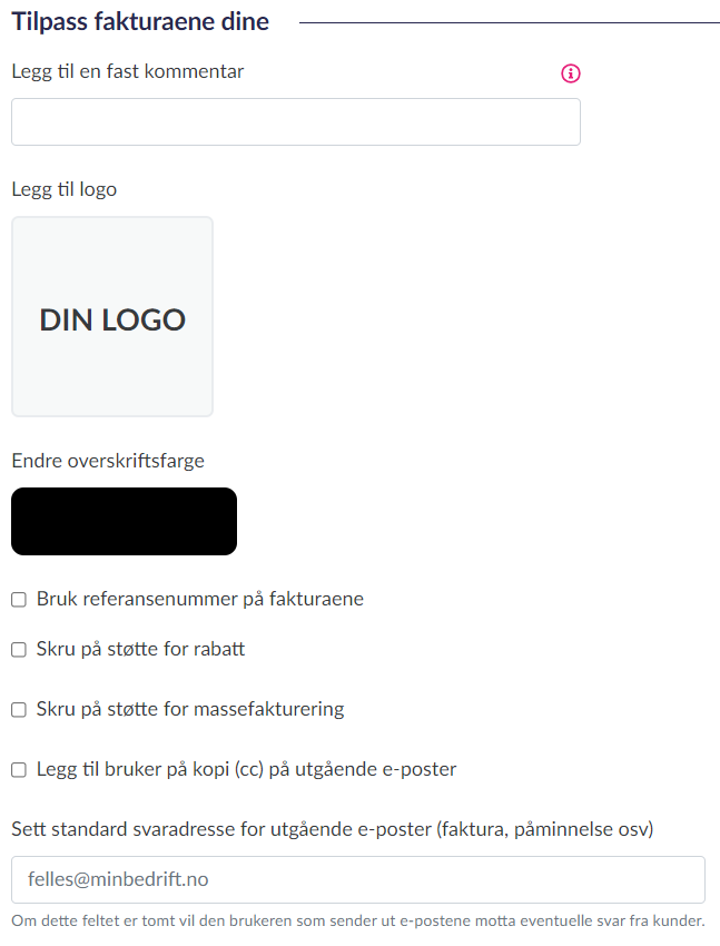 • Legg til logo : Last opp en logo. Denne vil vises på alle dine PDF-fakturaer.