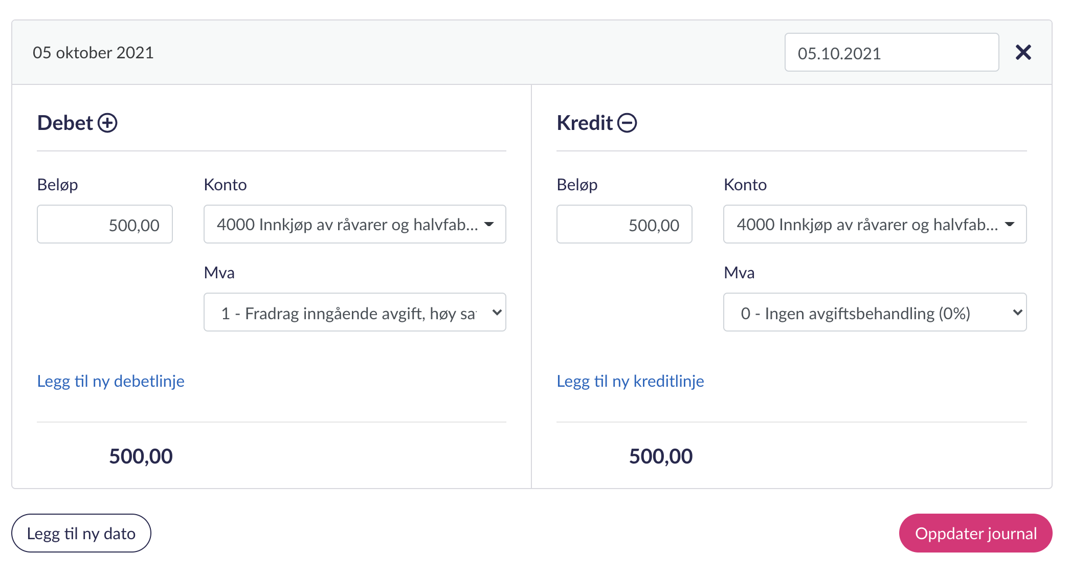 Hvis du forsøker å føre direkte mot konto 2700-2739 i manuelt bilag vil du få en feilmelding. Vi støtter ikke å føre direkte på mva-kontoer på denne måten fordi mva-koden ikke ville blitt med på føringen.