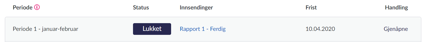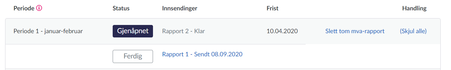 Ved gjenåpning lager systemet en ny rapport for perioden. Denne rapporten kalles en tilleggsmelding. Etter at du har gjort endringene du trengte å gjøre (f.eks. registrere en leverandørfaktura som du hadde glemt) og er ferdig med perioden, må tilleggsmeldingen sendes til Altinn. Dette er for å rapportere inn endringene som er gjort til skattemyndighetene.