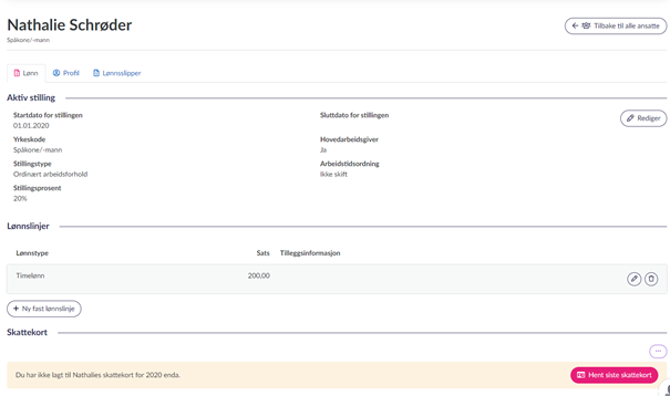 Du kan velge å hente skattekort per ansatt ved å gå inn på hver enkelte ansatt og klikke på «Hent siste skattekort» som vist på skjermbildet under.