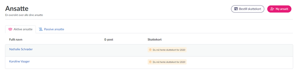 Alternativt, kan du først legge til alle dine ansatte og deretter gå tilbake til «Lønn» > «Ansatte». Oppe i høyre hjørne så kan du klikke på «Bestill skattekort». Da vil systemet hente siste skattekort for alle ansatte som er registrert. Dette er også stedet du henter skattekort for tidligere år.