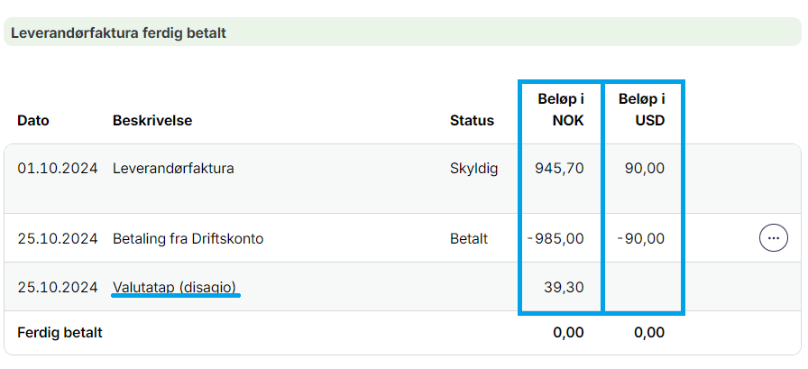 Hvis du har betalt i utenlandsk valuta vil du i denne posteringen se at vi regner ut en valutagevinst/valutatap (
