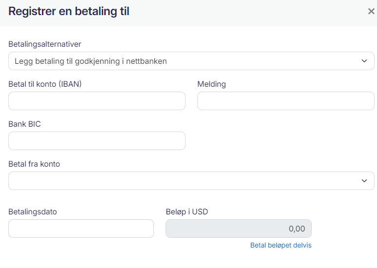 Bankintegrasjonsmodulen gjør det nå mulig å betale i utenlandsk valuta direkte fra systemet. Legger du til en betaling frem i tid binder du deg også til kursen som er gitt for den dagen du legger inn betalingen. Kursen er via vår betalingspartner og er stort sett bedre enn det du får i bankene. Den vil uansett bli oppgitt før du fullfører betalingen, så du kan sjekke selv på forhånd.