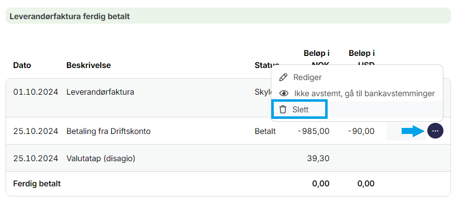 feil valuta, må du slette betalingen og føre den på nytt med riktig valuta.