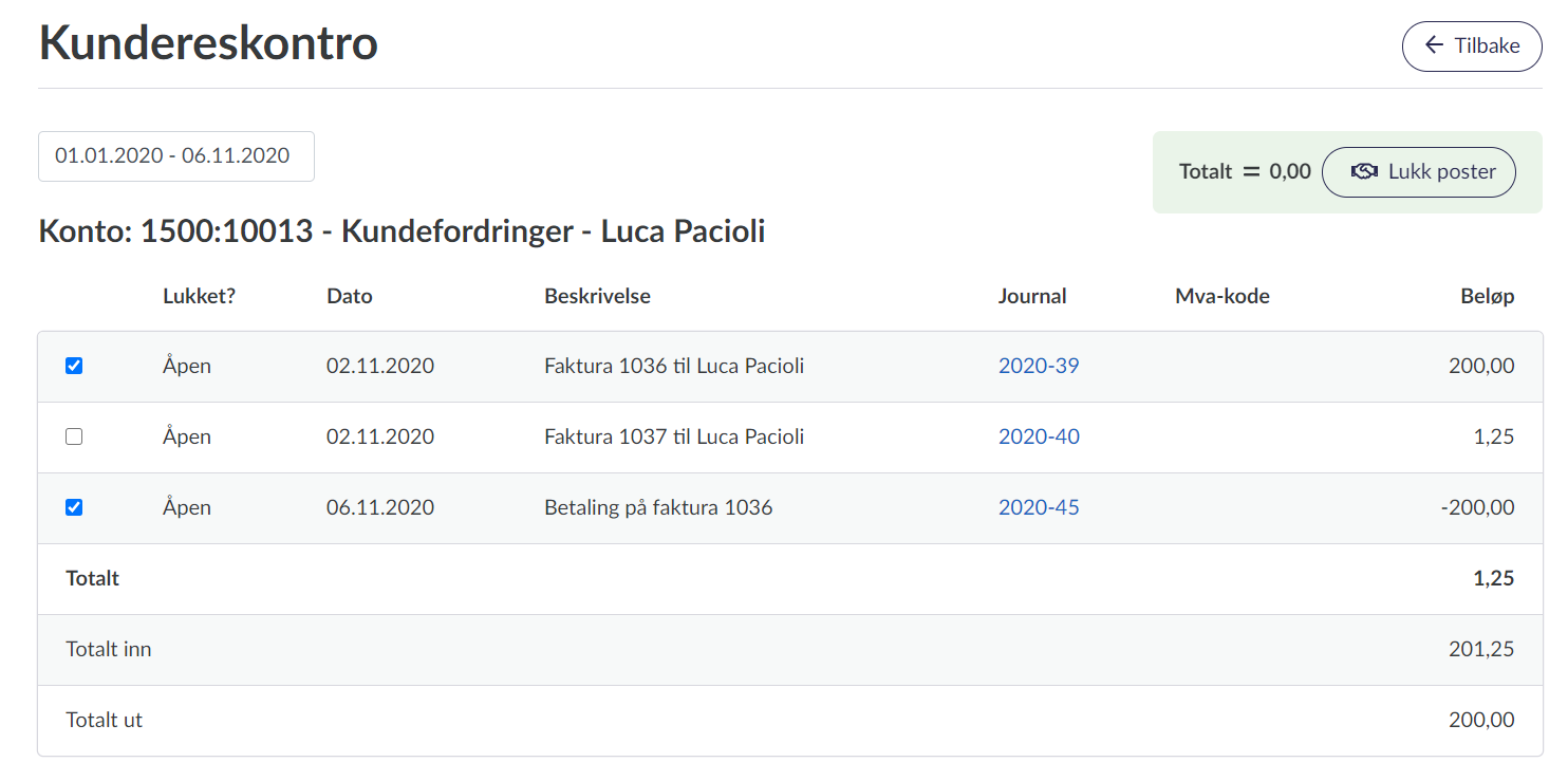 Du kan kun lukke poster som går totalt i 0,00,-. Det er for eksempel ikke mulig å lukke en kundefaktura med totalbeløp 100,00 mot en kreditnota som har totalbeløp -80,00, siden disse to beløpene ikke går i 0,00 totalt.