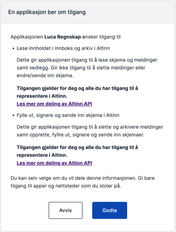 For å fullføre; velg Godta når du blir spurt om å gi Luca Regnskap tilgang til Altinn slik at vi
