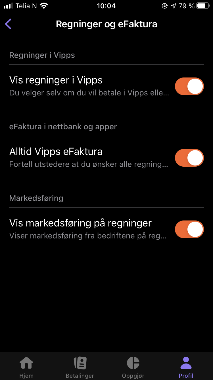 3. Aktiver “Vis regninger i Vipps” og “Alltid Vipps eFaktura”