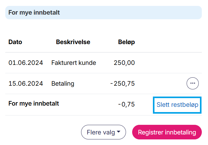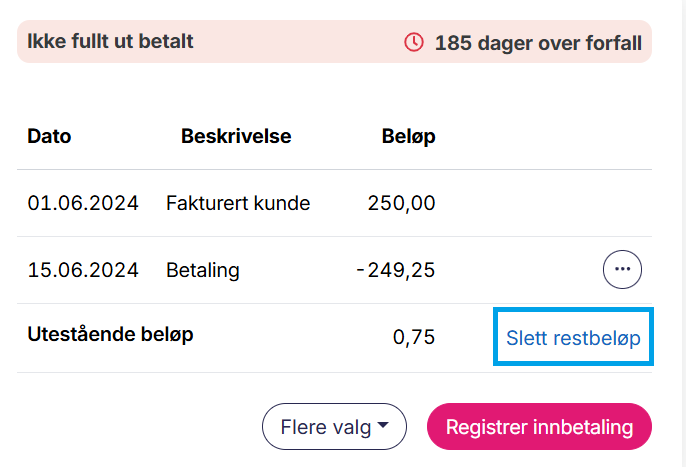 Gå til Salg → Faktura → velg kundefakturaen med øredifferansen → Velg Slett restbeløp