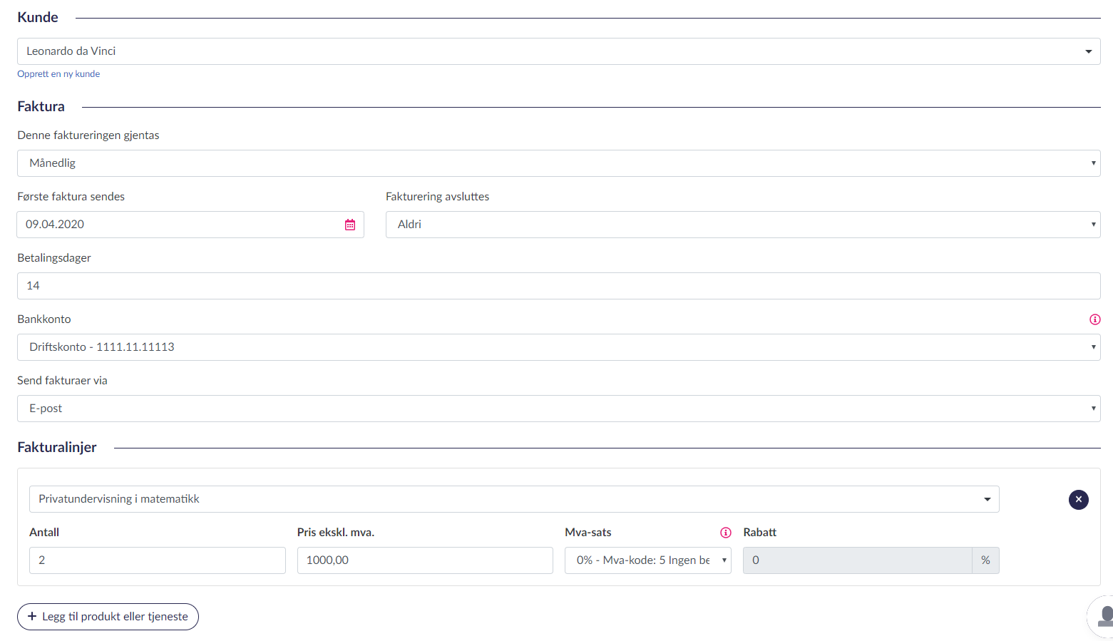 Repeterende faktura er nyttig for deg som sender den samme fakturaen hver uke, måned eller år. Denne funksjonaliteten gjør at du kun trenger å lage fakturaen én gang, og du velger hvor ofte og lenge den skal sendes til kunden din.