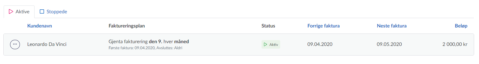 Status vil endres fra aktiv til stoppet. Du kan finne dine stoppede repeterende fakturaer under fanen “Stoppet”.