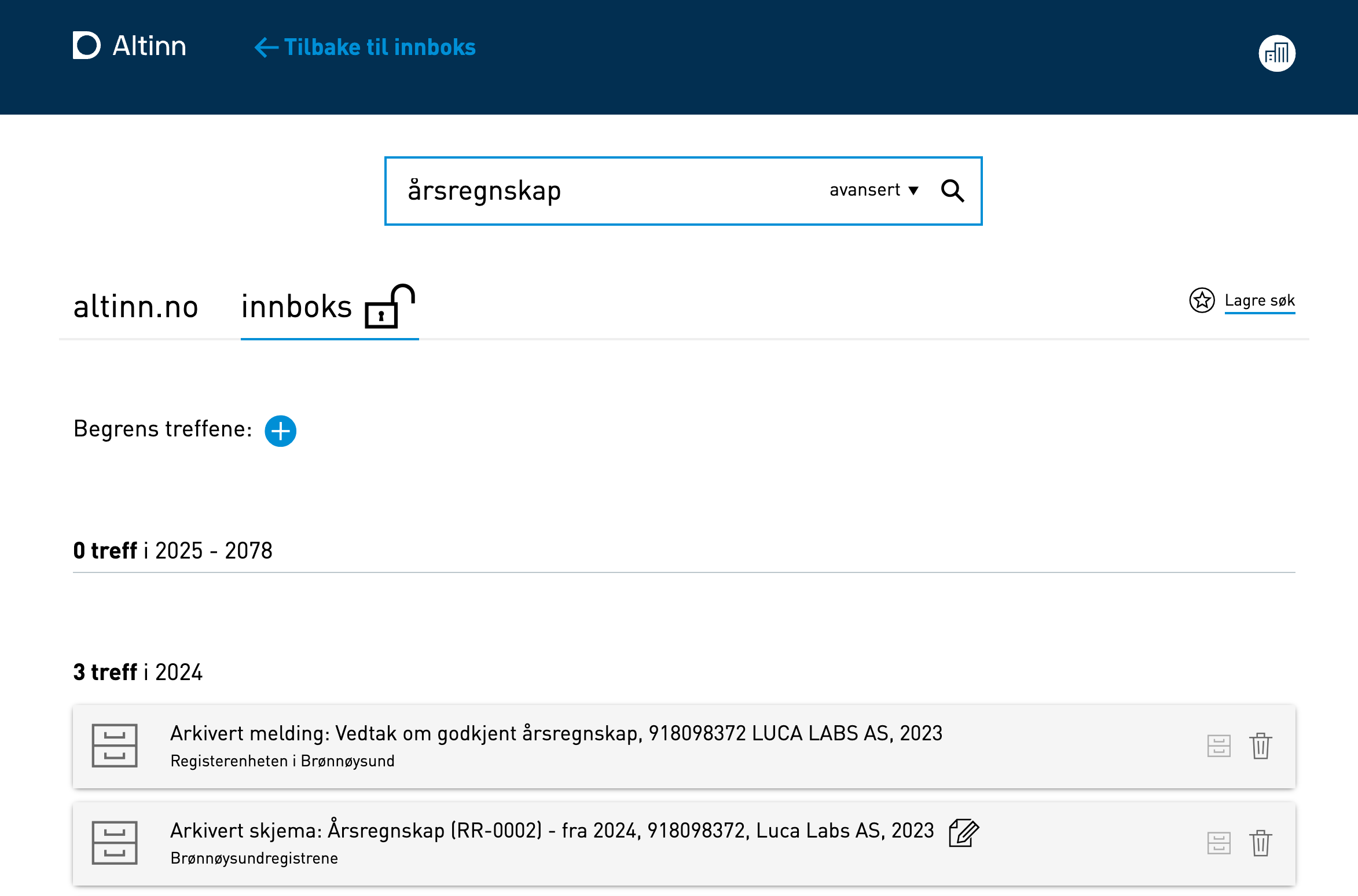 Signert og levert årsregnskap vil se slik ut din Altinn innboks: