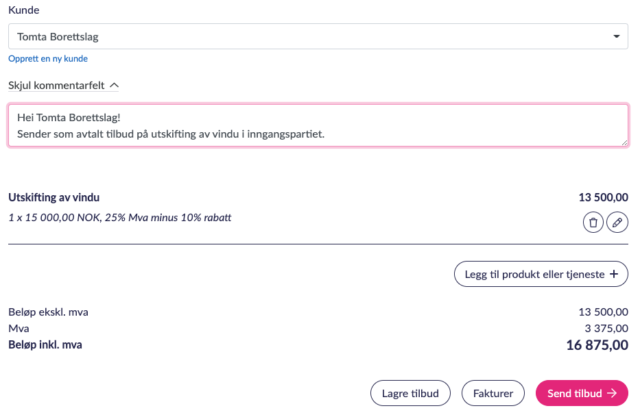 Det samme gjelder kontaktinformasjon og organisasjonsnummer for din egen bedrift. Alt er på rett sted. Det eneste du trenger å gjøre er å spesifisere i tekstfeltet hva du faktisk tilbyr.