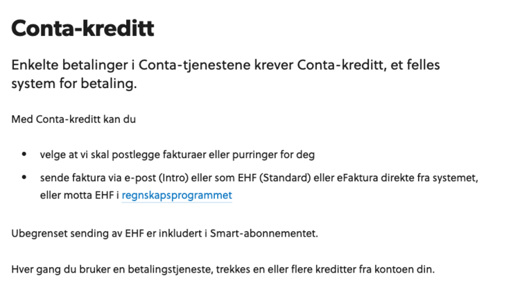 Med dette regnskapsprogrammet må du betale enkelte transaksjonskostnader, avhengig av hvilken versjon du velger. Merk deg også at du må kjøpe såkalt Conta-kreditt på forhånd for å kunne motta og sende faktura, samt enkelte andre operasjoner.