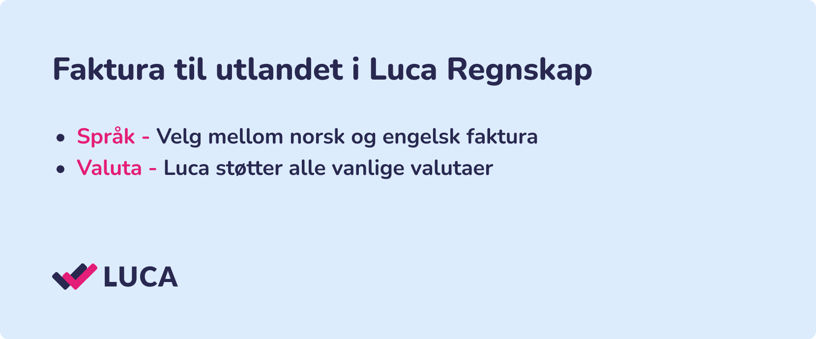 Det går fint å fakturere i utenlandsk valuta, og du kan til dels velge språk selv, men mva skal alltid oppgis i norske kroner. I Luca Regnskap er dette veldig enkelt. Systemet støtter alle vanlige valutaer, og uansett hvilken valuta du velger, blir fakturaen opprettet i henhold til lover og regler. Les artikkelen hvis du vil vite mer om kravene.