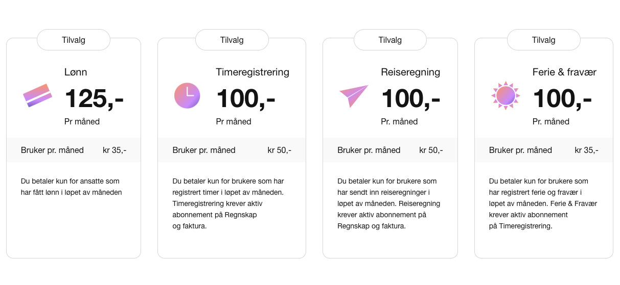 - Lønnsmodul – 125 kroner per måned + 35 kroner per måned per ansatt