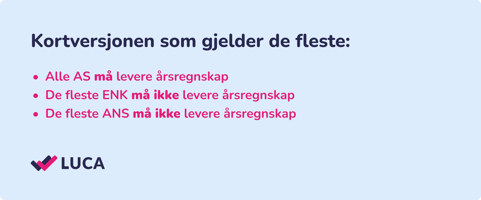 Størrelsen og organisasjonsformen er det som bestemmer om foretaket har regnskapsplikt eller ikke, og derav om årsregnskap må leveres. I tillegg har foretak som er under tilsyn av Finanstilsynet, samt regnskapsførere, revisorer og eiendomsmeglere, alltid regnskapsplikt.