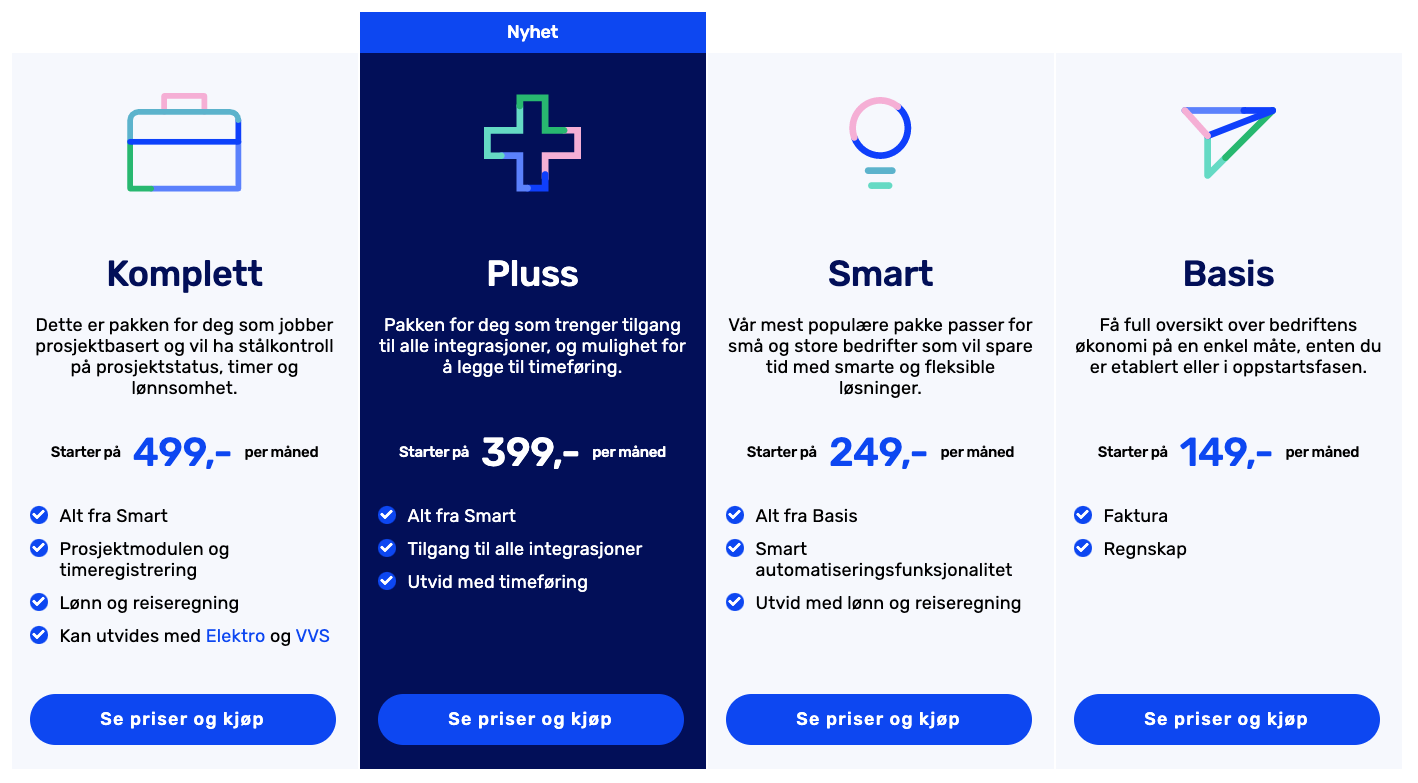 Tripletex gjør som en del andre aktører, og deler opp funksjonene du får tilgang til i ulike pakkeløsninger. Før vi ser på de ulike pakkene, gjør vi deg oppmerksom på følgende: