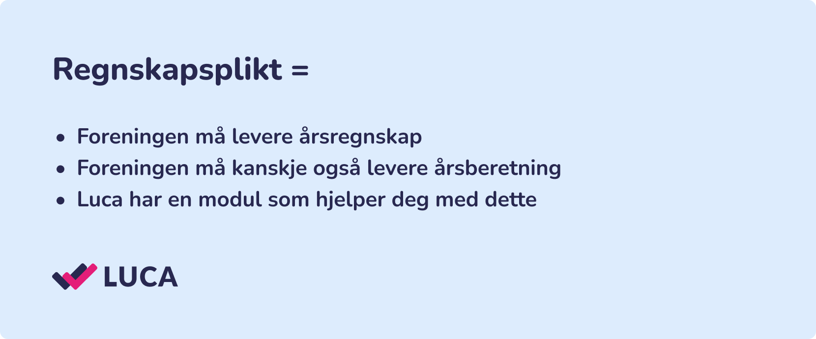 - Regnskapsplikt betyr at foreningen må levere årsregnskap.