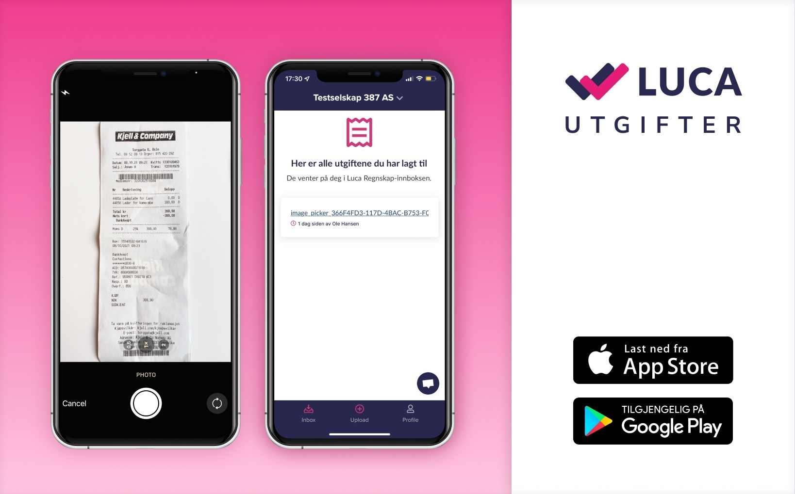 Forutsetningen er at du også skriver reiseregning og tar vare på kvitteringene. Reiseregningen kan du opprette veldig enkelt med mobilappen fra Luca Regnskap, som du også bruker til å ta bilde av kvitteringene med (Luca tolker kvitteringene og hjelper deg med å då utgiften bokført riktig).