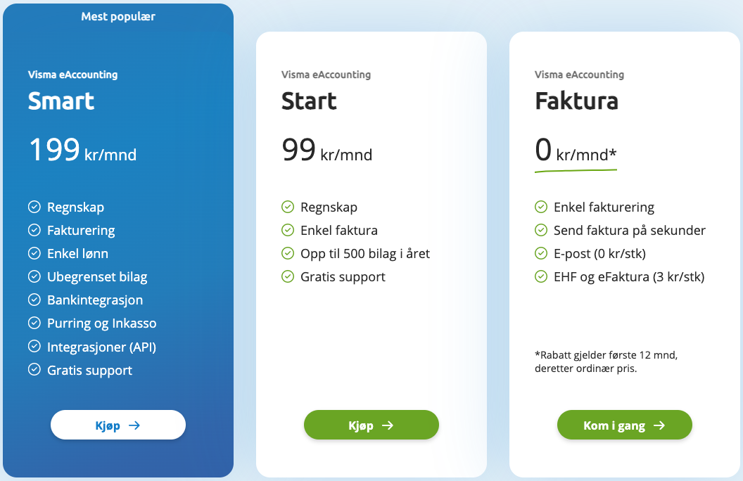 - Smart - Inkluderer alt i grunnpakken, samt blant annet enkel lønn, KID-nummer på faktura, massefakturering og repeterende faktura